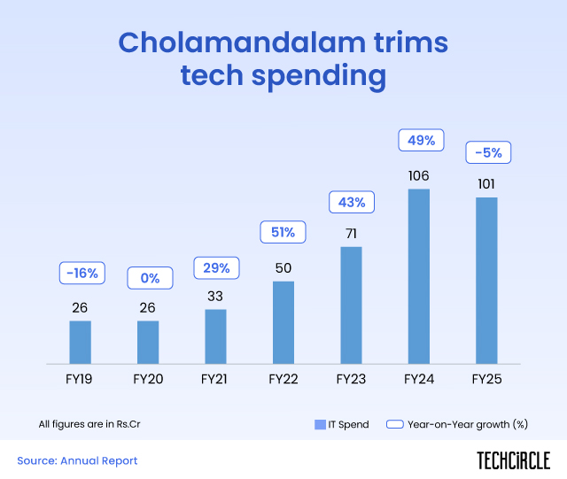 According to the company’s annual reports of the last 5 years, compiled by TechCircle, the Murugappa Group NBFC has cut its technology spending in FY25 to ₹101 crore, a 5% decline from the previous year. This marks the first contraction in digital investments in five years and comes after a period of aggressive scale-up.
