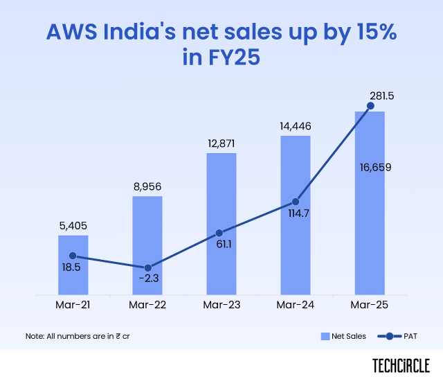 Amazon Web Services (AWS) India, which started its operations in 2016 as Amazon Internet Services, recorded net sales of ₹16,659 crore (`$2 billion) in FY25. It is up by 15% from the previous year’s figure of ₹14,446 crore.